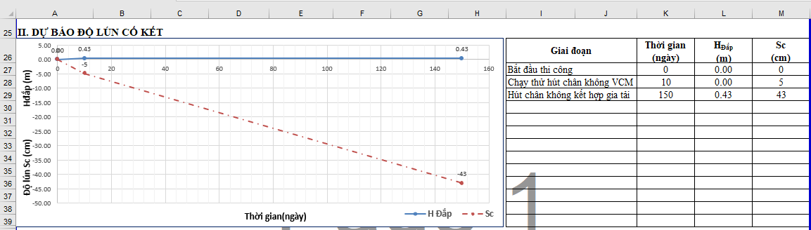 Biểu đồ tiến trình đắp và độ lún trong mục "II.DỰ BÁO ĐỘ LÚN CỐ KẾT" sẽ được vẽ lại tự động.