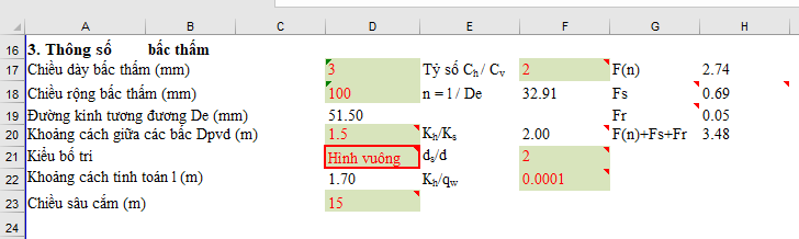 ✅ Ô D20 - giá trị khoảng cách giữa các bấc thấm, lấy từ 1.3 => 2 m. Giá trị thông dụng là 1.5m