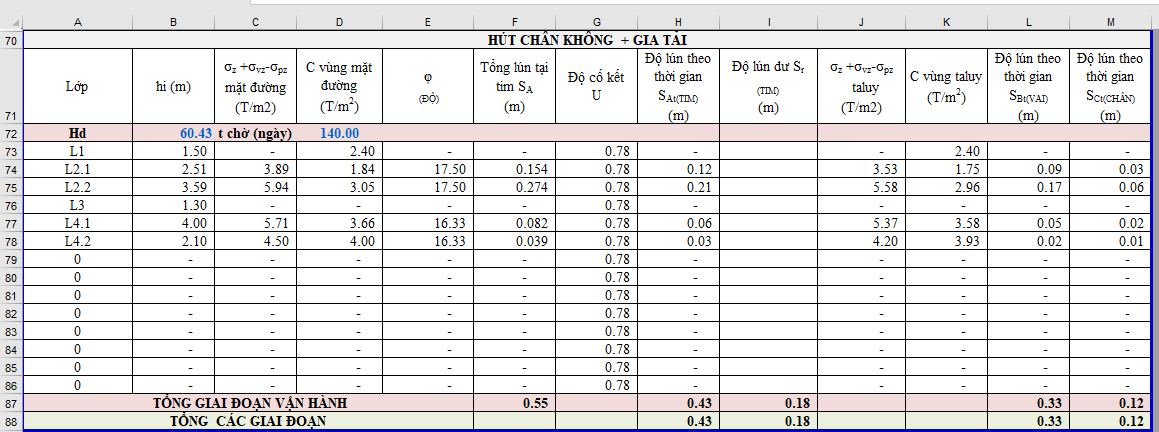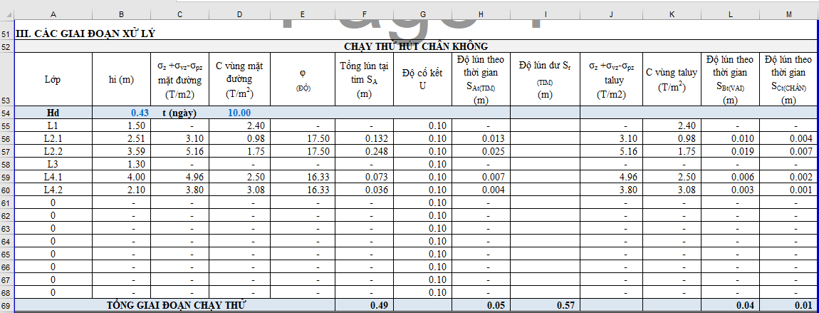 ✅ Ô F17 - giá trị tỷ số Ch/Cv: Giá trị này lấy từ 2 đến 5, lấy càng cao thì thời gian chờ lún càng nhanh. Đối với biện pháp hút chân không, dòng thoát nước theo phương ngang mạnh hơn so với biện pháp gia tải, vì vậy giá trị này có thể chọn = 3.