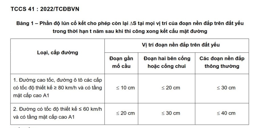 ☑️Giải thích kỹ hơn về ý 1, ở ý này tiêu chuẩn có nói "sau khi hoàn thành công trình nền mặt đường xây dựng trên vùng đất yếu, phần độ lún cố kết ΔS tiếp tục xảy ra sau đó tại trục tim của nền đường được cho phép như bảng 1".