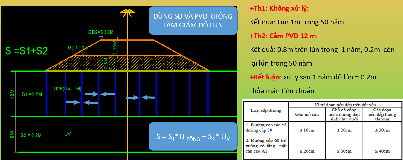 Nếu không xử lý, tổng độ lún S = S₁ + S₂ ≈ 1,0 m sẽ xảy ra rất chậm, có thể kéo dài khoảng 50 năm, không đáp ứng yêu cầu khai thác công trình.