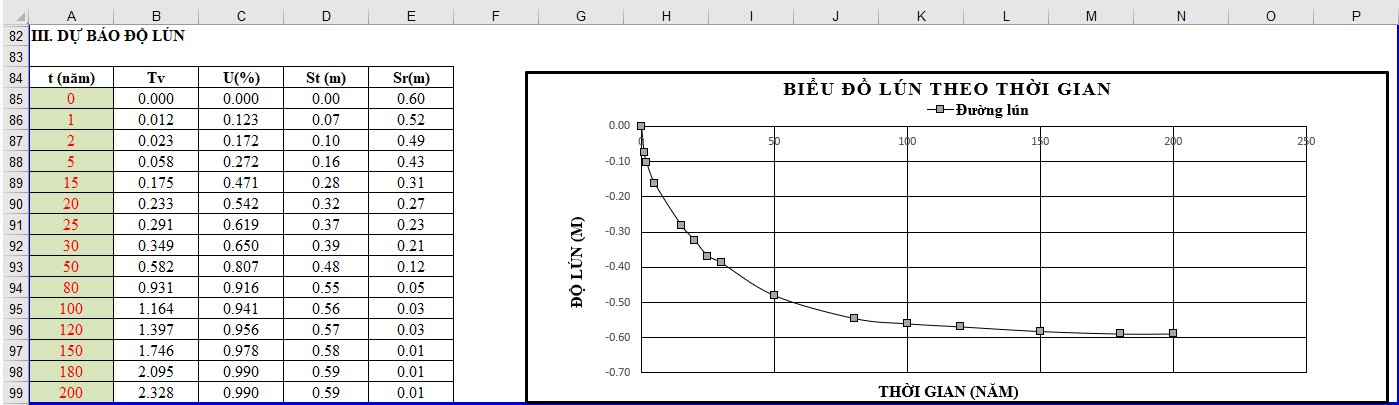 🔸Bước 3: Đây là bước dự báo lún độ lún cố kết theo thời gian, bạn thay đổi giá trị các ô trong cột t(năm), biểu đồ lún theo thời gian bên cạnh sẽ tự cập nhật lại. Ý nghĩa của các cột như sau: