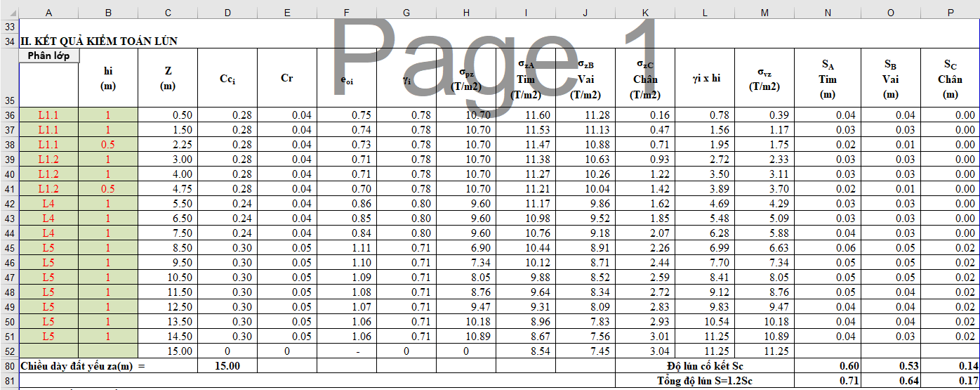 Sau khi thực hiện xong 2 bước này, độ lún của các phân lớp và tổng độ lún của nền được thể hiện ở bảng phía dưới