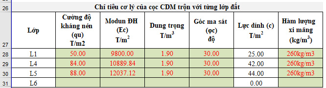 Khai báo chỉ tiêu cơ lý của cọc CDM trộn với từng lớp đất