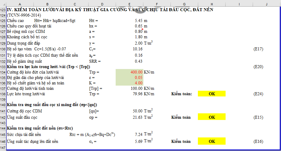 Trong mục kiểm toán này, phần tính toán sức chịu tải của cọc CDM, của đất nền đều được thực hiện tự động. Riêng phần vải địa/lưới địa bạn cần khai báo vào để bảng tính có thông số kiểm toán