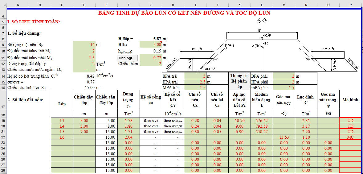 Trong mọi phương án xử lý nền đất yếu, tính lún và dự báo độ lún cố kết là bước bắt buộc nhằm xác định tổng độ lún dự kiến, từ đó làm cơ sở quyết định có cần xử lý nền hay không. Nội dung nguyên lý và phương pháp tính đã được trình bày chi tiết trong bài Hướng dẫn tính lún và dự báo độ lún cố kết. Trong bài viết này, mình không lặp lại phần lý thuyết, mà tập trung trình bày kết quả và các bước nhập liệu – tính toán thực tế.